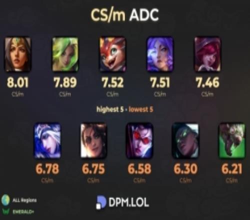 體育資訊10月1日報道宣稱 根據(jù)國外數(shù)據(jù)網(wǎng)站DPM.LOL統(tǒng)計,當(dāng)前版本每分鐘補刀數(shù)最高及最低的ADC:
