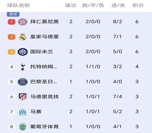 拜仁積6分以凈勝球優(yōu)勢(shì)高居積分榜第一,同分的皇馬和國(guó)米緊隨其后,緊跟著積4分的熱刺,積3分的巴黎、馬競(jìng)和馬賽等隊(duì),本菲卡積0分位列第30,同樣0分的阿拉木圖凱拉特第36墊底!