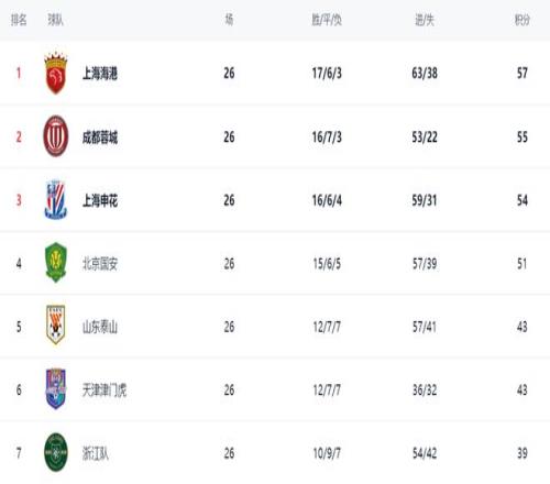 在積分榜上,上海海港以57分高居榜首。排名第2的是成都蓉城,拿到55分,落后2分,依然有奪冠的希望。上海申花54分排名第3。第4的是北京國安,拿到51分,落后榜首6分,爭冠希望渺茫。而山東泰山拿到平局之后,總積分是43分,升到第5名。天津津門虎也是43分,排名第6。第7的浙江隊(duì)拿到39分。