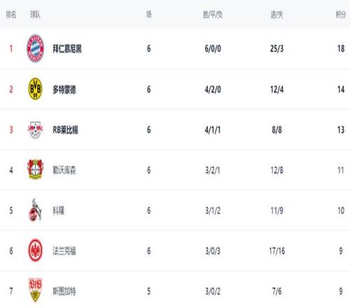 在積分榜上,拜仁6戰(zhàn)全勝,以18分高居榜首,獨(dú)一檔的存在。而這輪丟掉2分的多特蒙德則以14分排名第2。萊比錫13分,排名第3。勒沃庫(kù)森3勝2平1負(fù),拿到11分,排名第4??坡∫?0分排名第5。法蘭克福和斯圖加特都是9分,排名第6和第7。