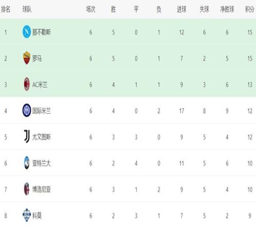 在積分榜,榜首易主了。那不勒斯5勝1負(fù),拿到15分,排名榜首。羅馬的戰(zhàn)績和那不勒斯一樣,也是15分,但凈勝球少,只能排名第2。AC米蘭以13分排名第3。國際米蘭12分,排名第4。尤文圖斯也是12分,凈勝球太少,排名第5。亞特蘭大和博洛尼亞都是10個(gè)積分。