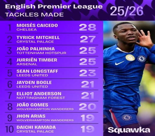 北京時(shí)間10月7日,知名數(shù)據(jù)機(jī)構(gòu)Squawka統(tǒng)計(jì)出了本賽季英超前7輪過后搶斷數(shù)排名前10的球員,切爾西的中場(chǎng)大將莫伊塞斯-凱塞多以28次排名第一,水晶宮的左后衛(wèi)泰里克-米切爾以27次位列第二,托特納姆熱刺中場(chǎng)帕利尼亞以及阿森納的右后衛(wèi)廷貝爾同以25次并列第三。