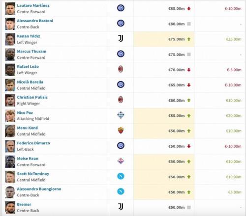 本期德轉(zhuǎn)意甲身價(jià)更新中,上漲最多的是尤文新星伊爾迪茲,身價(jià)上漲2500萬(wàn)歐,科莫隊(duì)的尼科-帕斯身價(jià)上漲了2000萬(wàn)歐。下跌最多的則是亞特蘭大前鋒盧克曼,下跌了2000萬(wàn)歐。