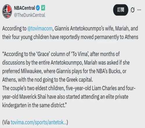 據(jù)希臘主流紙媒《To Vima》報道,經(jīng)過字母哥一家數(shù)月的討論后,字母哥的妻子瑪利亞選擇帶著4個孩子搬離密爾沃基,回到希臘首都雅典居住,字母哥的兩個大兒子——五歲的Liam-Charles和四歲的Maverick-Shai——都已經(jīng)在雅典的一所精英私立幼兒園上學(xué)了。