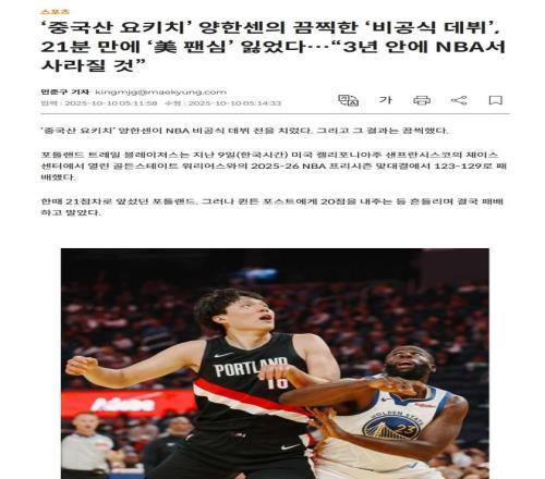 大家都擔(dān)心他到底能不能夠在NBA發(fā)展,他能不能夠像當(dāng)初的前輩姚明一樣,在籃球的最高殿堂闖出一片天。隨著這場比賽結(jié)束后,目前韓國媒體也是看熱鬧不嫌事大,在他們的社交平臺刊登了一篇文章,點評了本次楊瀚森NBA季前賽的首秀。還引用了國外網(wǎng)友的一句話,認為這位中國的約基奇在三年內(nèi)必定會在NBA消失。