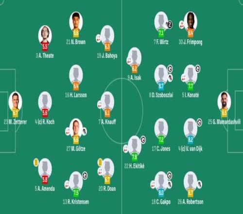 法蘭克福首發(fā):23-澤特爾、3-泰特、4-科赫、5-阿曼達(dá)、13-克里斯滕森(59'34-科林斯)、21-布朗、16-拉爾森、27-格策(64'8-沙伊比)、7-克瑙夫(76'15-斯希里)、19-巴霍亞(59'9-伯卡特)、20-堂安律(64'42-烏尊)
