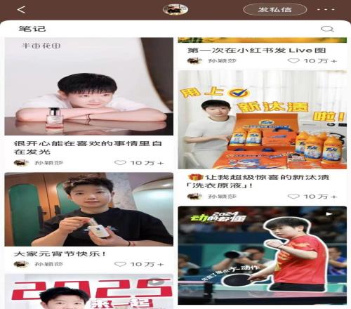 孫穎莎是乒乓球運動員中代言最多的一個。僅2025年,她在微博上發(fā)布的合作品牌有肯德基、半畝花田、理膚泉、高露潔、OPPO、一汽紅旗、碧然德、OLAY、徐福記、妮維雅、梅森馬吉拉香氛、美團(tuán)、維達(dá)、全棉時代、脆生生薯條、李寧、多芬、香飄飄、KitKat奇巧、Keep、breo倍輕松、YAYA鴨鴨,平均每季度新增3個合作。