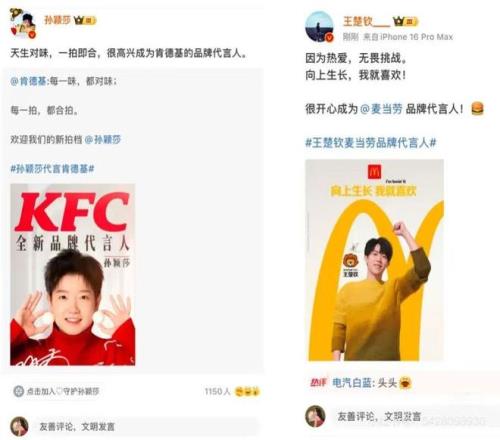 在一眾合作中,非體育領(lǐng)域的代言占比鮮明,涵蓋了普通人生活的方方面面。值得一提的是,在肯德基官宣孫穎莎為品牌代言人后,麥當(dāng)勞迅速跟進(jìn)簽下王楚欽,體壇最受關(guān)注的“莎頭CP”引發(fā)了麥肯大戰(zhàn)。這也是一場被調(diào)侃為史上最陰險的商戰(zhàn),因為粉絲不知道這頓到底該點肯德基還是麥當(dāng)勞,最終受傷的只有體重和德克士。