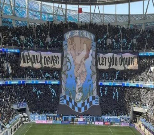 如果問在整個中國足球里,哪支球隊最擅長用TIFO表達球隊精氣神,大連隊無疑是中超獨一檔的存在。天藍色與黑色相連接的TIFO,橫擺在巨大的看臺之上,盡管大連的球隊曾經(jīng)有著豪門冠軍榮耀,但后來一度跌跌撞撞,在中甲中乙徘徊,近幾個賽季才重新殺回中超,“WE ARE DALIAN”的巨大橫幅,彰顯了球迷對大連這座足球城市的無限熱愛。