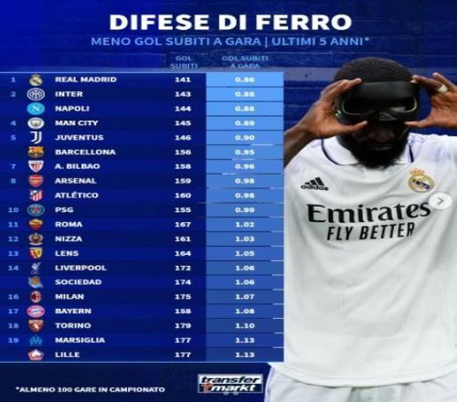 1、皇家馬德里:總失球141,場(chǎng)均0.86